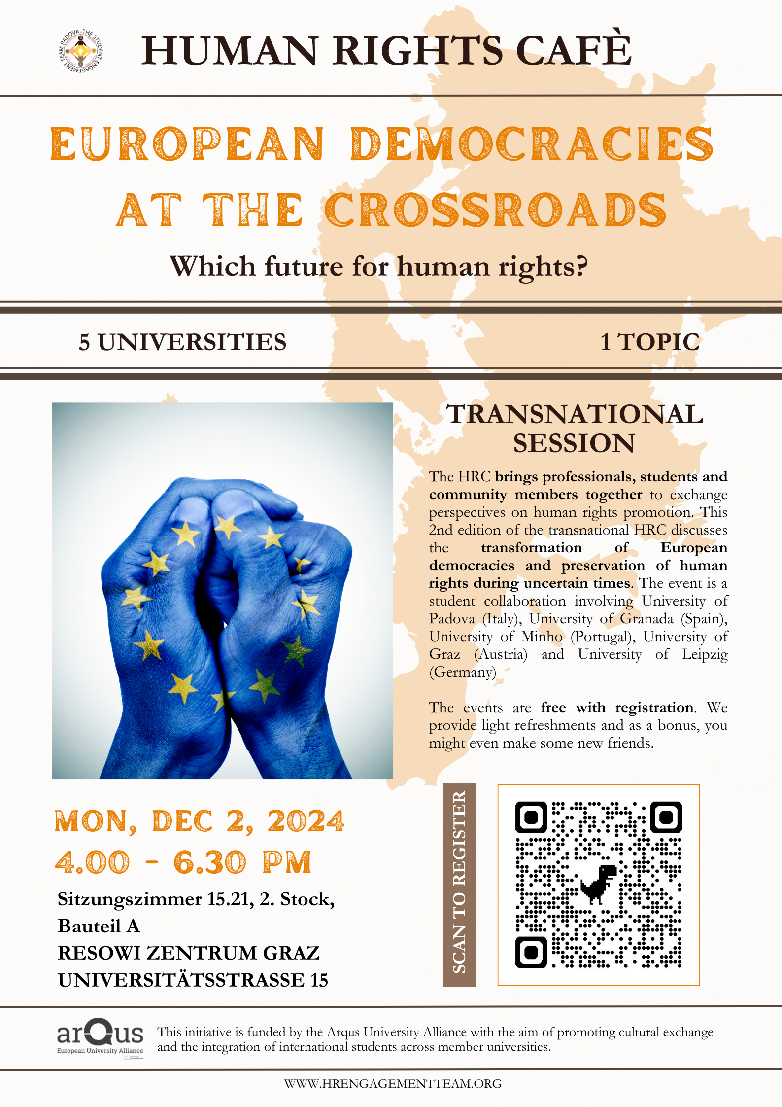 The Human Rights Cafè, organized by the Arqus European University Alliance, brings professionals, students and community members together to exchange perspectives on human rights promotion. The discussion will take place in three working groups on different topics under the common theme of the transformation of European democracies and preservation of human rights during uncertain times.