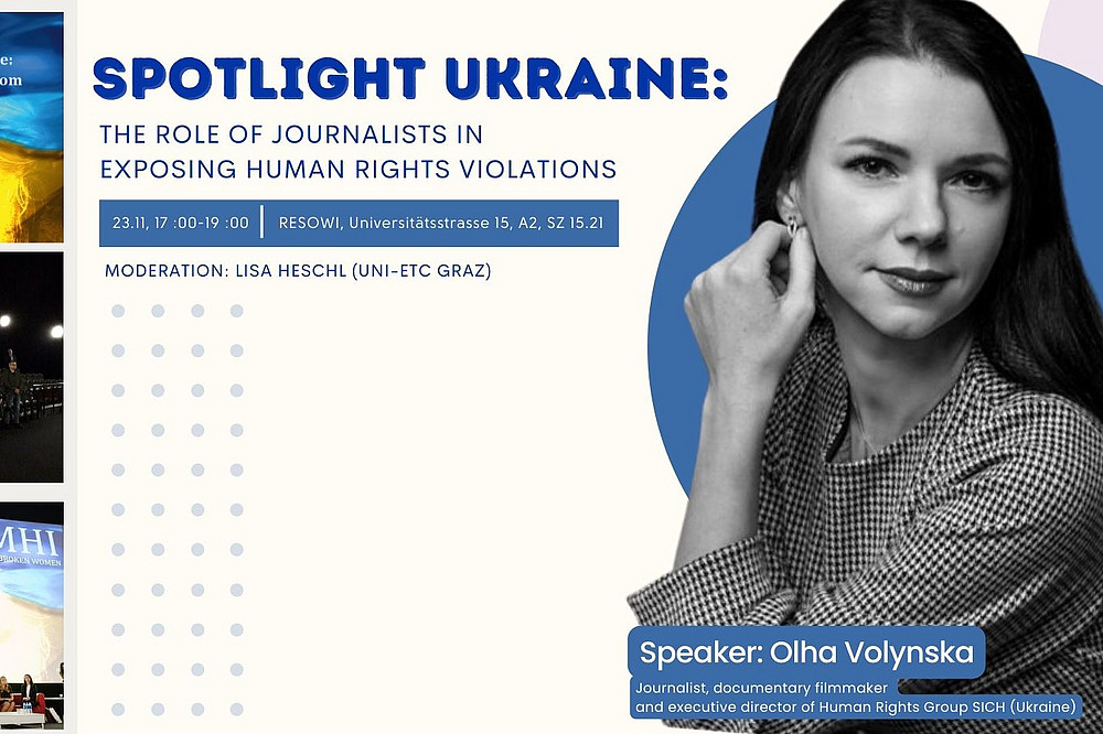 Journalists play a crucial role in exposing human rights violations in times of peace and particularly in times of war. Investigating and reporting about human rights violations not only comes with a great risk for the lives of journalists, they also bear great responsibilities to report in an objective, ethical and objective manner. Olha Bozhko, a journalist, filmmaker and human rights defender, presents her work and the work of the human rights protection group SICH to identify and document war crimes in the ongoing conflict and to provide free legal assistance to victims.