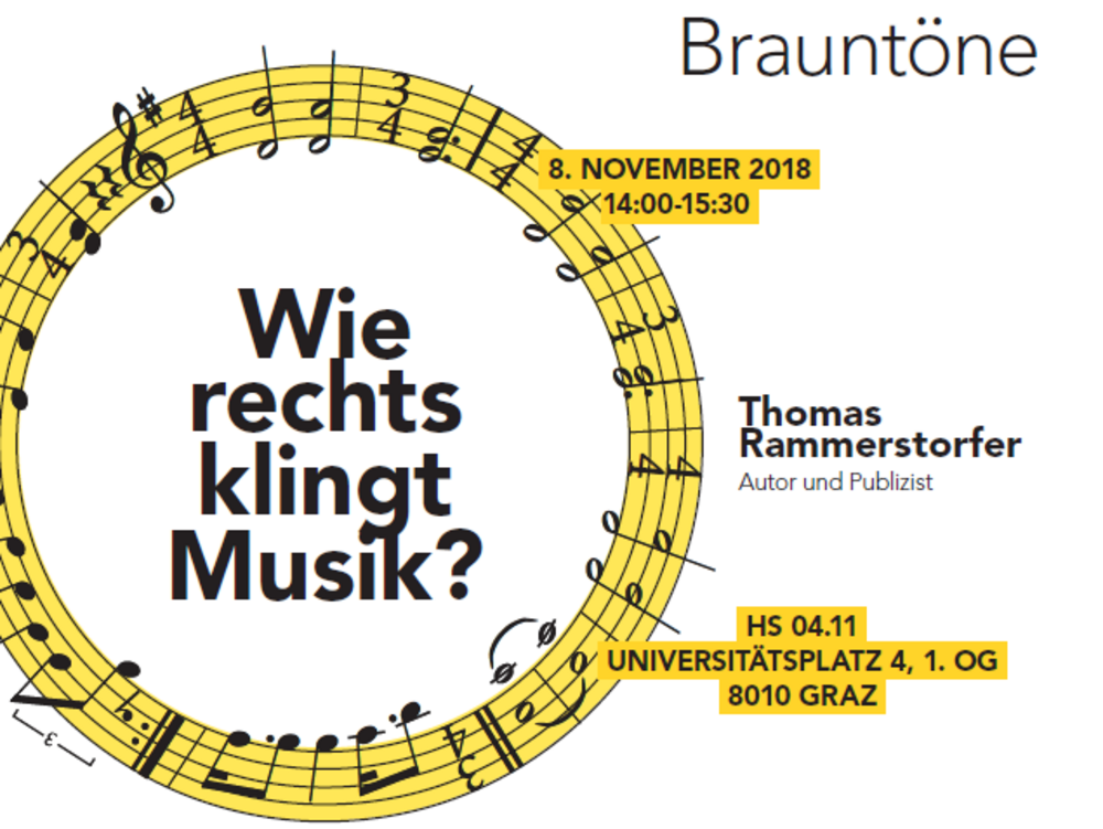Im Rahmen der in diesem Semester erstmalig angebotenen Lehrveranstaltung "Music and Human Rights" lädt Autor und Publizist Thomas Rammerstorfer zu einer Geisterbahnfahrt in die musikalischen Abgründe der braunen Rattenfänger, deren Repertoire sich längst vom Skinhead-Rock in fast jede denkbare Musikrichtung erweitert hat – vom Metal bis hin zu Techno, Hip Hop und Schlager. Nicht ohne Auswirkungen auf den Mainstream, wo rechtskonservative Ideen von Bands wie Frei.Wild verbreitet werden. Die Lehrveranstaltungseinheit ist für Studierende aller Fakultäten und die interessierte Öffentlichkeit zugänglich, eine Anmeldung ist nicht vonnöten.